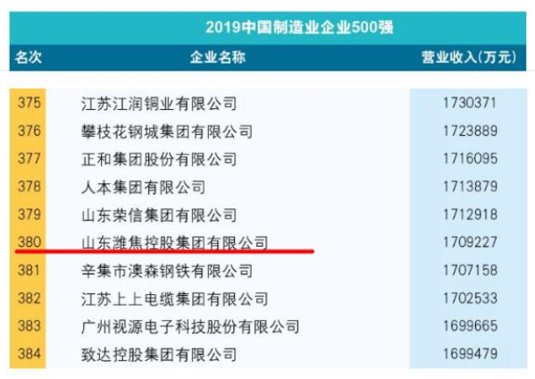 近日,在2019中國(guó)500強(qiáng)企業(yè)高峰論壇上,中國(guó)企業(yè)聯(lián)合會(huì)、中國(guó)企業(yè)家協(xié)會(huì)聯(lián)合發(fā)布了“2019中國(guó)制造業(yè)企業(yè)500強(qiáng)”榜單,山東濰焦控股集團(tuán)有限公司再次榮登榜單,位列中國(guó)制造業(yè)企業(yè)500強(qiáng)第380位,比去年提高了一個(gè)位次。